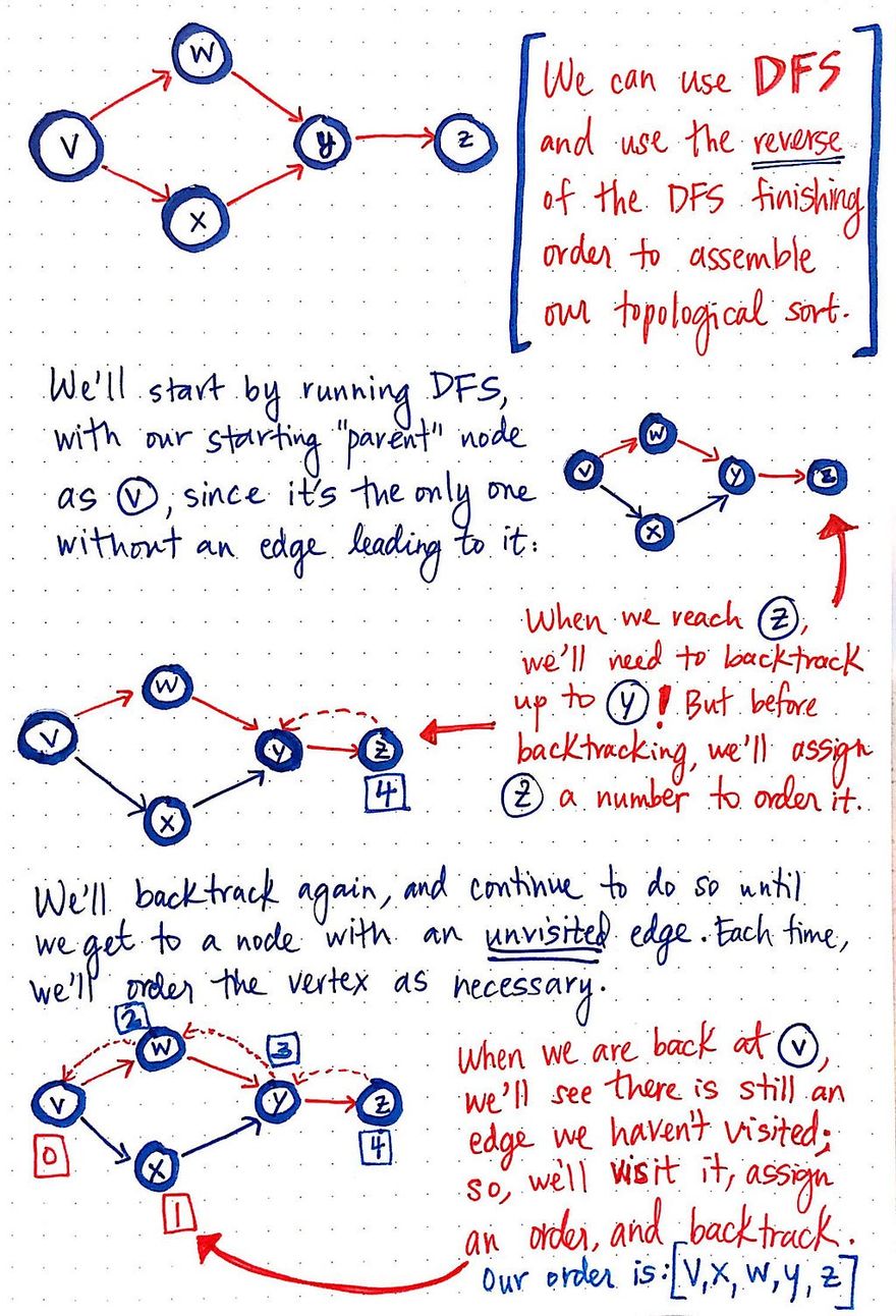 There are a few different approaches to topological sort, but I find that understanding it from the context of depth-first search and cycles in a graph to be the easiest. Thankfully, there are some good resources out there that break down how topological sort works in other contexts, not to mention all the extensive resources on directed acyclic graphs! Here are some of my favorites if you want to keep learning.