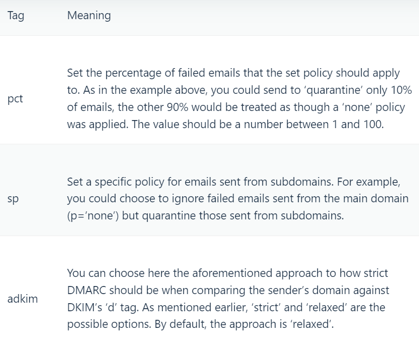 To see other customizable tags, head to the original Mailtrap article which explains what DMARC is.
