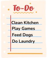 There is the option to do kitchen or laundry, then we know we have to feed the dogs. So, we end up with kitchen or laundry and feed_dogs. Wait, we need games too and only have energy for three things on our list! Today, we decide the kitchen will probably not get done.