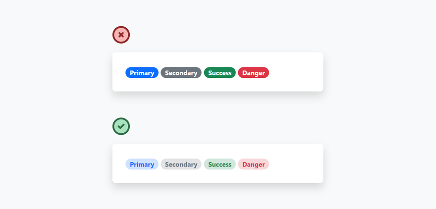 Bootstrap pill colors are harsh. You can use the --bs-bg-opacity CSS variable that comes with Bootstrap. This will soften the background color to create better contrast.