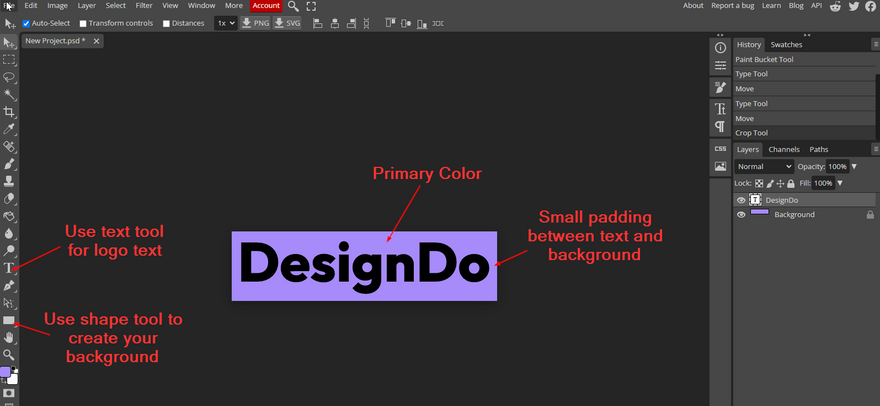 For the DesignDo logo, I’m just going to use the name as the text with extrabold font. The background will be my primary color.
