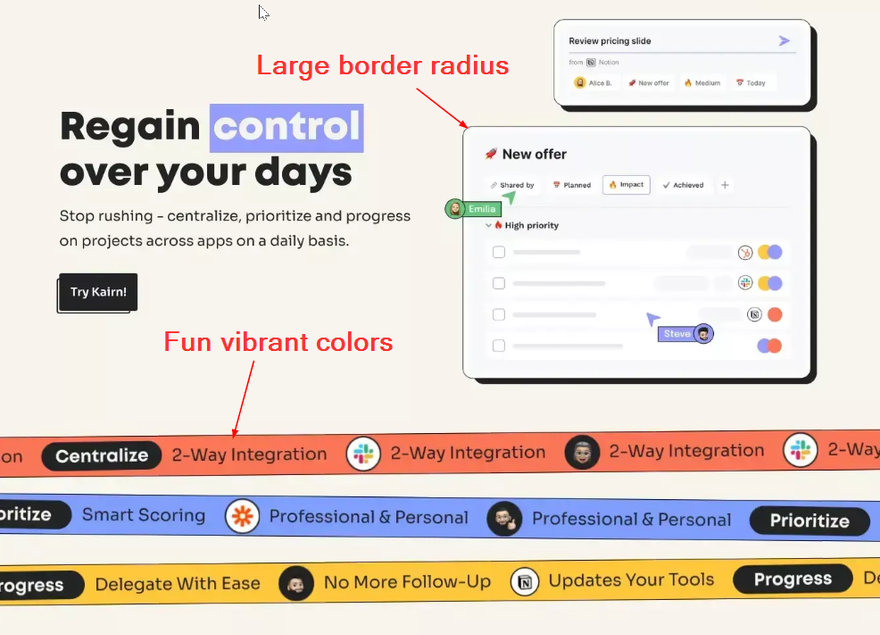 Border Radius: Use a medium to large border-radius. Pick 1 though. Do not mix different border-radius sizes. Keep it consistent.