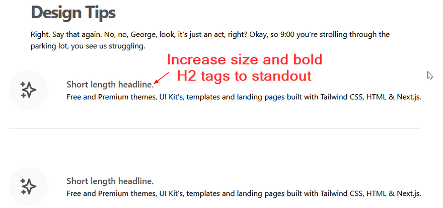 The “Short Length Headline” is an H2 but it’s using the same styles as its description below it. We want the headline of the tip to stand out and get the reader's attention. I’m going to increase its size and font weight slightly (we don’t want it larger than the H1 tag above it).