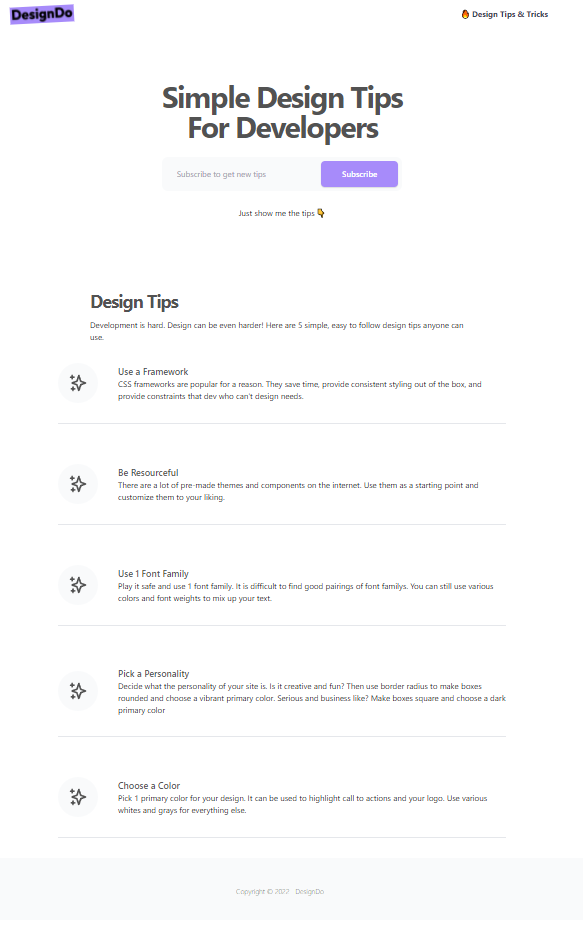 This guide will cover the tools, techniques, and resources I use for designing websites. It is not the end all be all but it is a great guideline for people who struggle with design. We are going to build an application called DesignDo. It will be a collection of design tips and resources (so meta!). Everything we use will be 100% free. To keep our focus on the point of this post, we won’t be using a front end framework. Just static HTML.