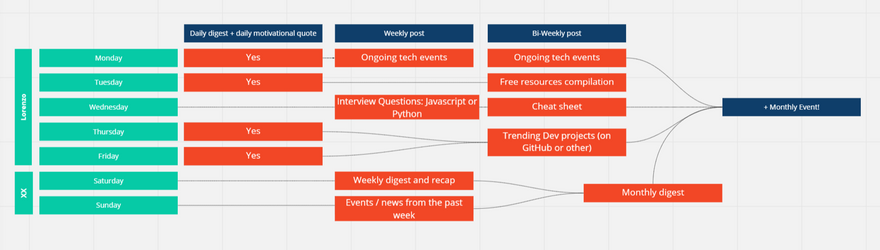 Or: What do we do? Although we have already drawn the lines of our future path, they have not yet been drawn. We plan to start as a dev.to based blogging organization, with different series running contemporaneously. Discord will allow us to be more user-focused. We don't want to be static. The main objective of going beyond a simple blog is to empower communication between developers and pair programming. Look at other famous websites in programming: Stack Overflow, GitHub, or even Dev.to. They are all based on devs helping other devs. And this is what we want to do. To do this we are building a cooperation program between developers. The ones more experimented will partner with a newcomer in programming. Then each binomial can participate in coding events that we will host, with special prizes for πwinnersπ. This leads to another of our big objectives. We will be πππ₯ππ§π, mostly with daily articles and monthly events, and trying to improve every day.