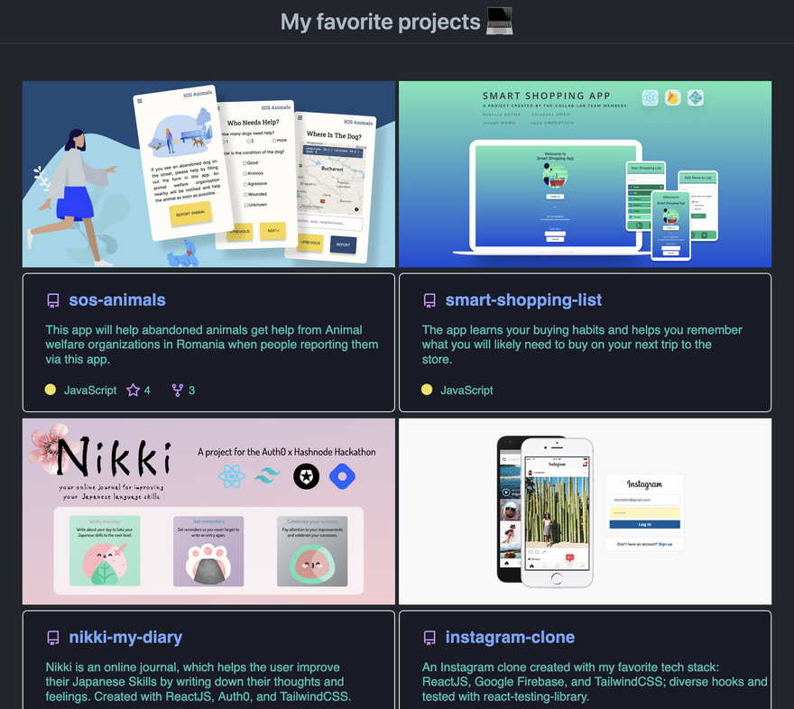 I have received many compliments for this section, so I encourage you to showcase your projects as best you can. I have created a thumbnail for all my projects and included it above the stats that are automatically generated with readme-stats.