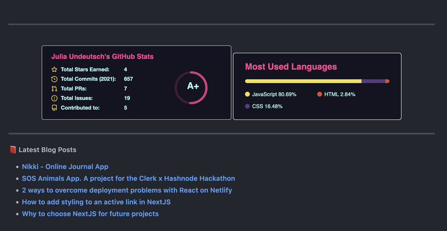 At the bottom of my profile, I've added statistics about my time on GitHub and the programming languages I use most often. These stats are also generated using GitHub stats.