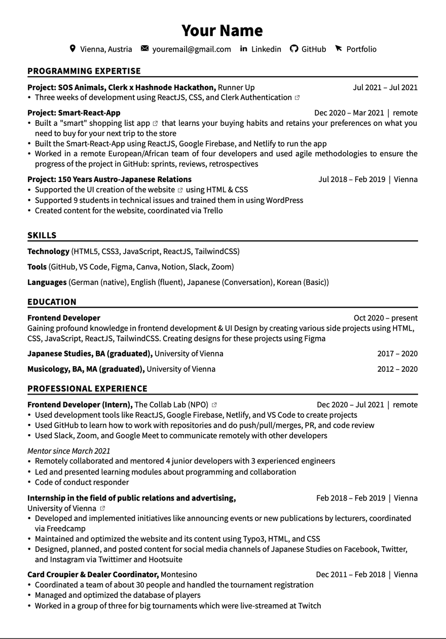 I created my resume with flowCV, but you can choose any tool you like best. (e.g. Canva, Google Docs, Microsoft Word, to name a few).