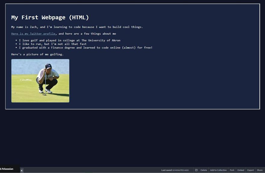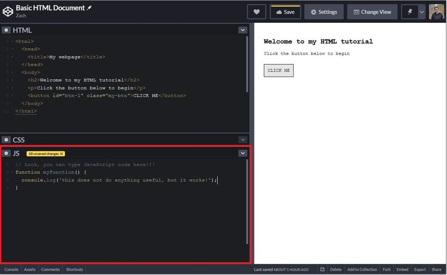 This code above is hosted on Codepen, which we will be using frequently for the next few lessons. I recommend creating a free account so you can follow along.