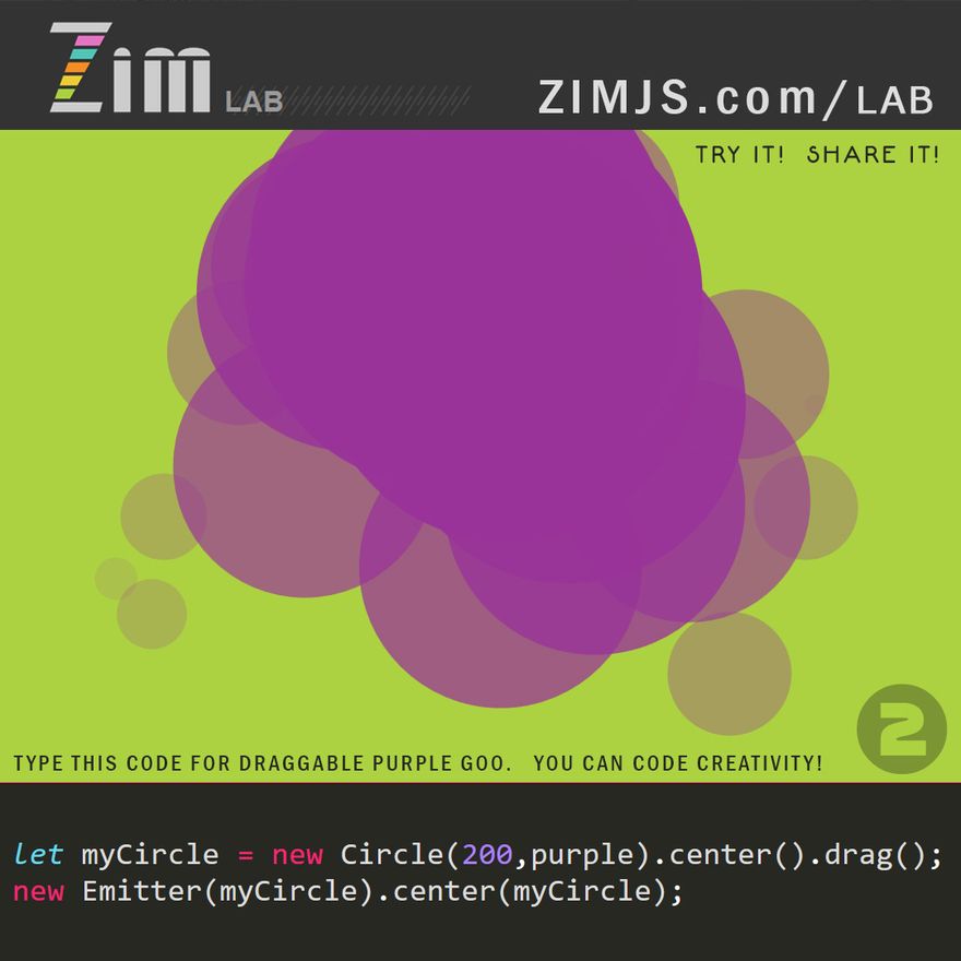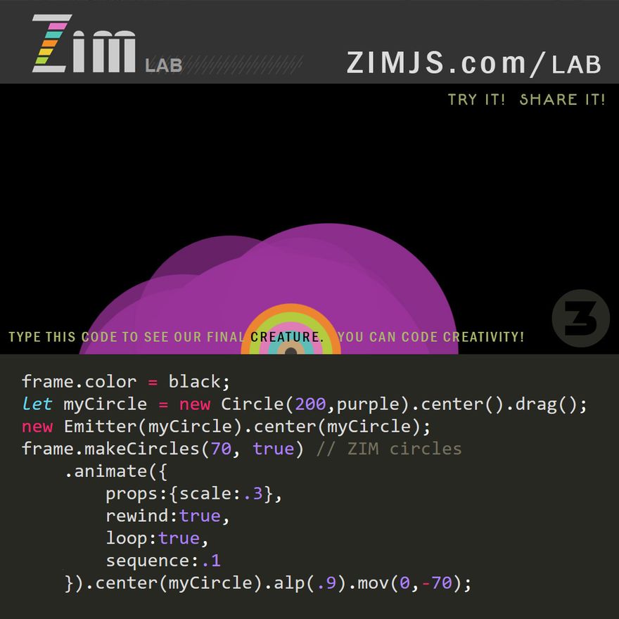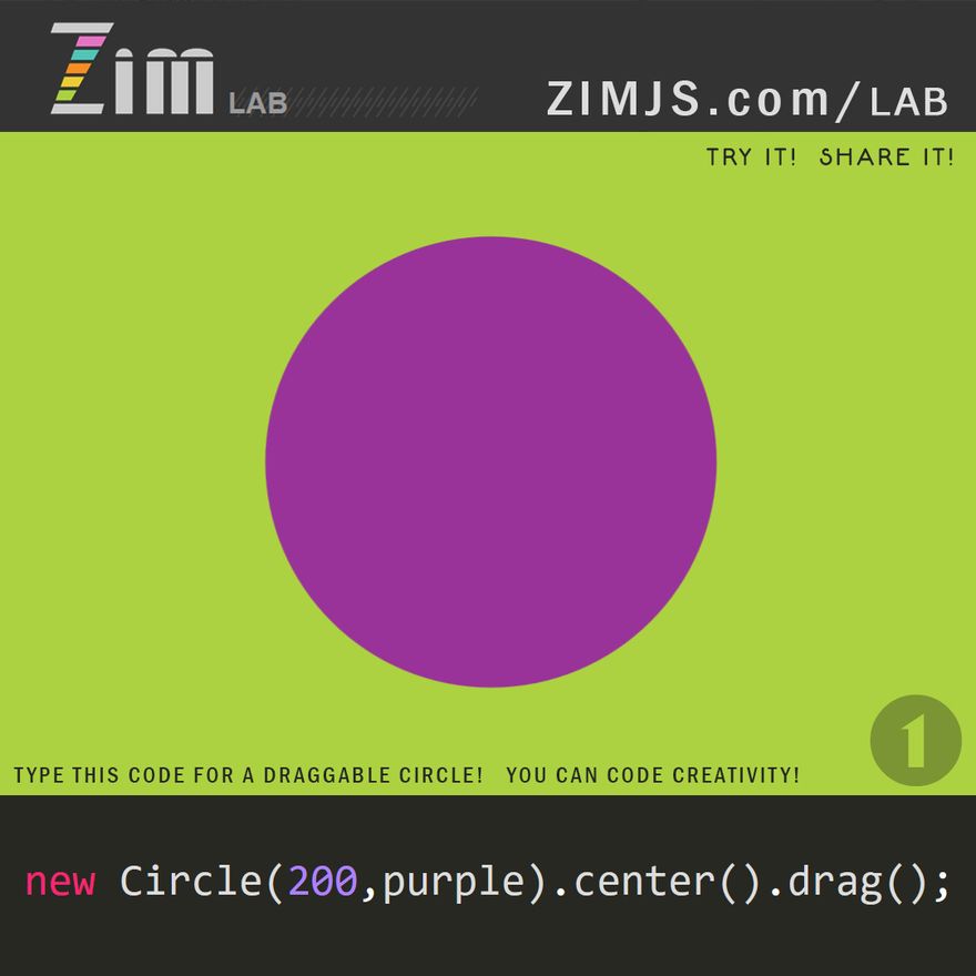 The Lab has built in ZIM examples or you can experiment with your own ZIM code at https://zimjs.com/lab Try typing in: